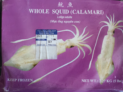 Yesterday, I found we still owned a large box of frozen calamari. I really don’t remember when I bought this. That label shows the old address of Wai Yee Hong, before they moved to their magnificent new building, so it has to be quite old. £4.90 for that amount of squid must have seemed a tremendous bargain, at the time. Maybe I thought I’d be able to separate a few at a time, or something?