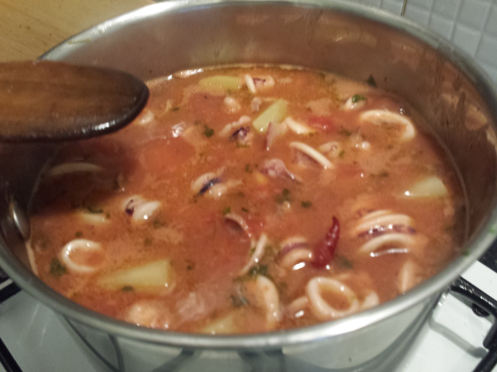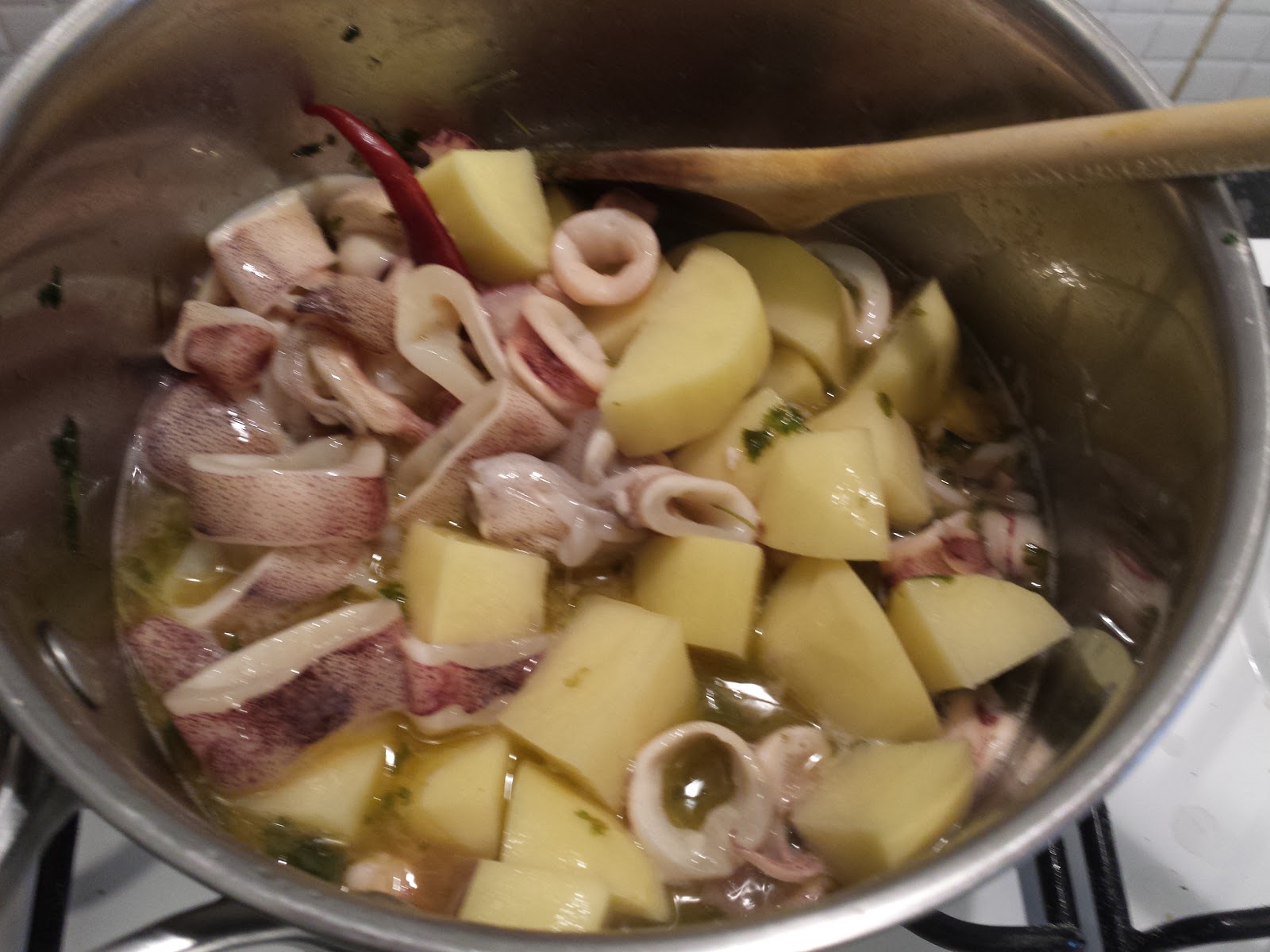 It was time to look for recipes. I found an Italian one, for a squid and potato stew, on The Telegraph’s web site. It required a respectable amount of garlic, so I chose it. There’s a fancy Rick Stein one online, as well, but I didn’t have all the numerous ingredients he thinks should go in there.