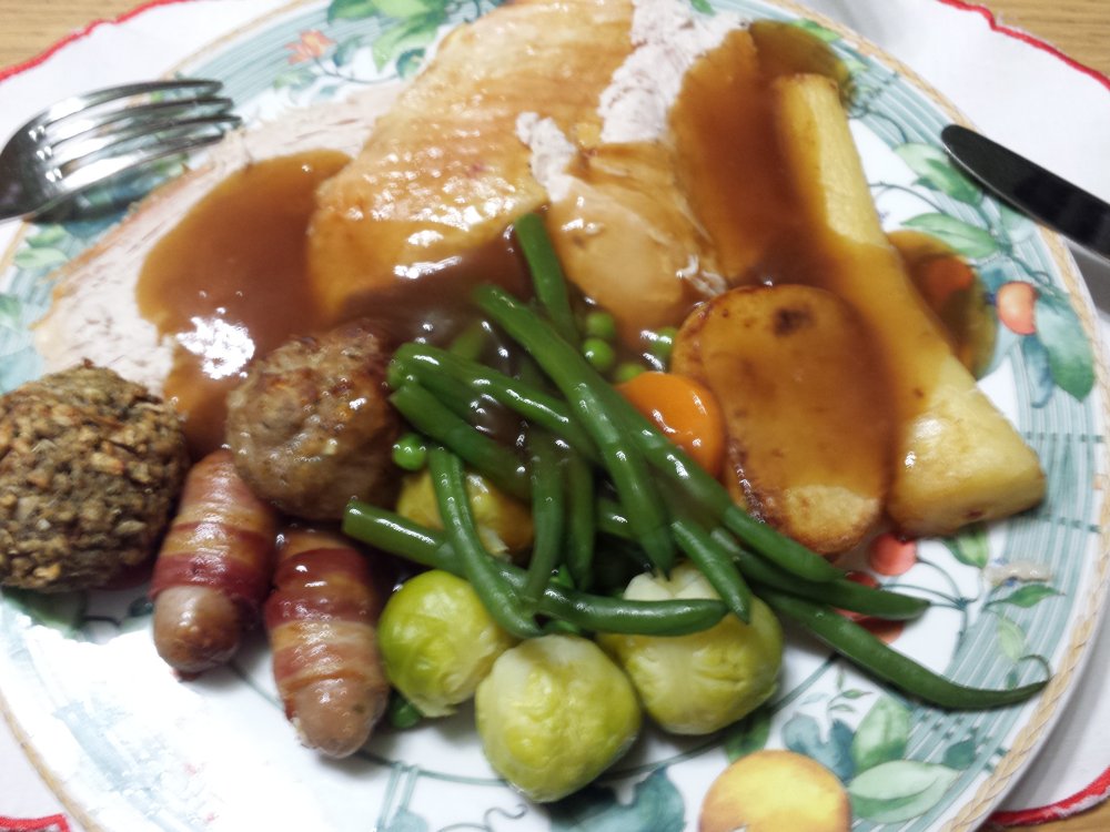 Turkey, Cameron’s delights, sage and onion stuffing, sausage-meat stuffing, roast potato, roast parsnip, carrot, peas, green beans, Brussels sprouts, and gravy.