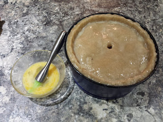 So, a third of the pastry is waiting to become the lid of the pie. I’ve lined the tin with the rolled out three quarters of it, and done my best to make sure there are no cracks. In goes the meat, and at this point, I’m wondering how Mr Hayward managed to get four boiled eggs in his pie as well as 1200g of meat.