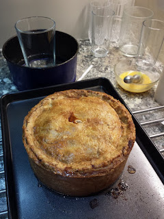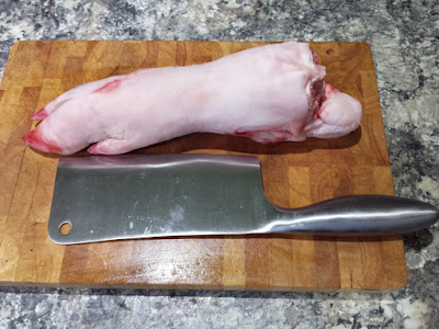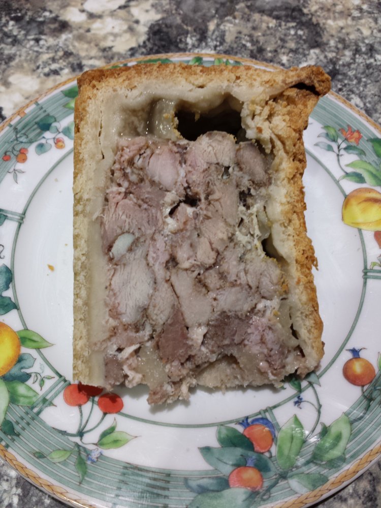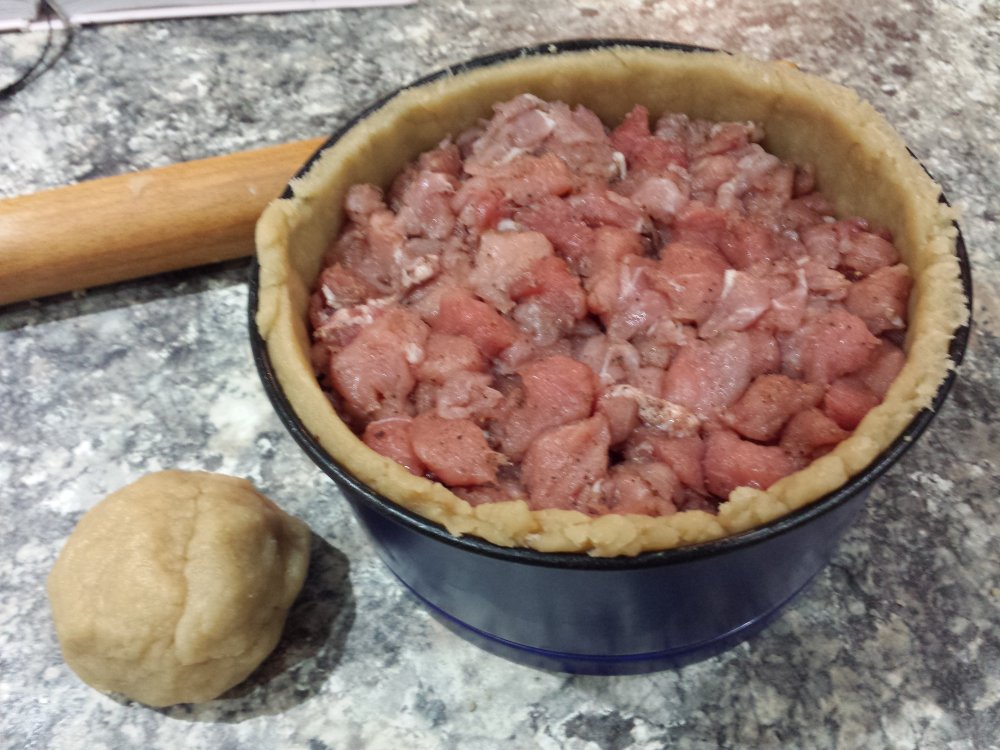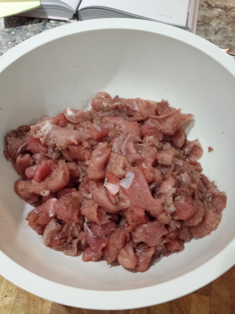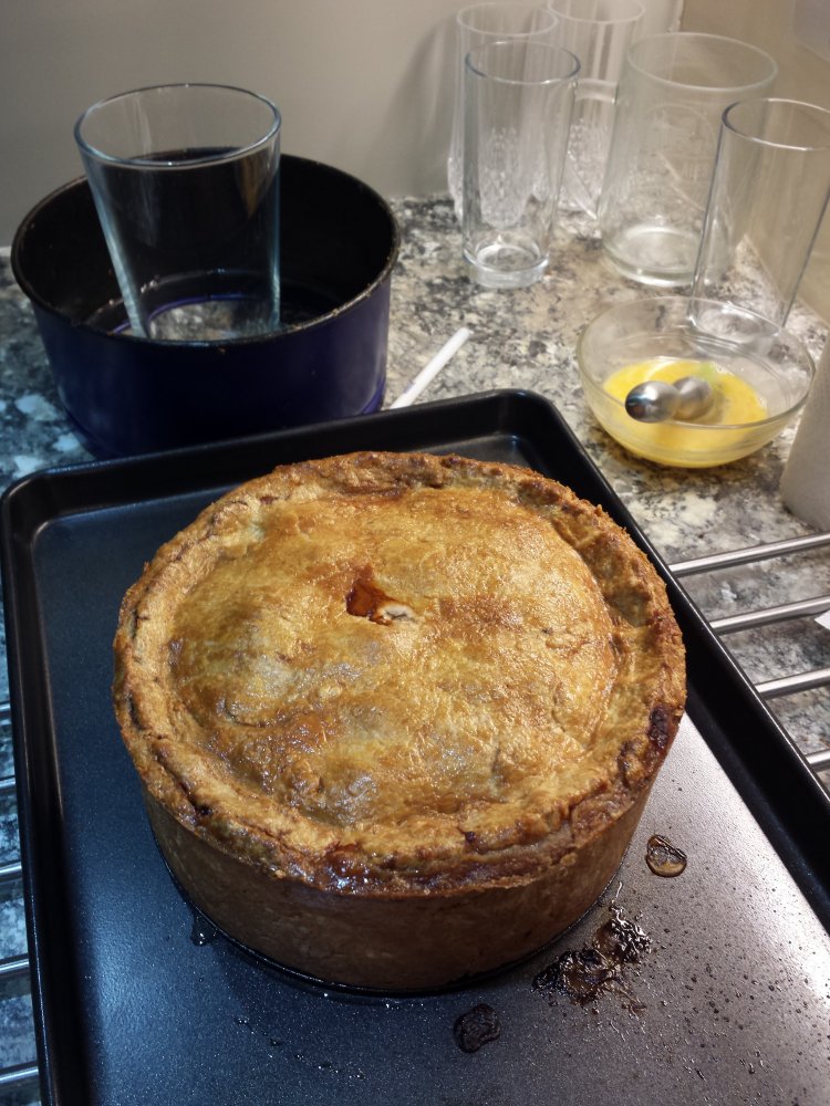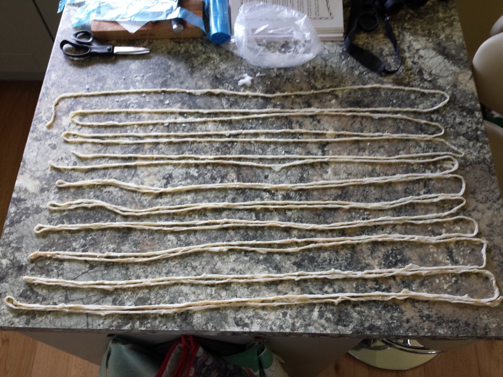 Here we go! The meat has been in the freezer for an hour. You do that so it is cut up without all the juices escaping when you mince it. I don’t have any pictures of the mincing happening, as I really didn’t want to get raw pork all over my phone, but I promise you the mincing did happen. The garlic went in at this stage, to save the faff of crushing it separately. The box with the yellow lid contains the zest of two unwaxed oranges. Once the meat and garlic were minced, I added the herbs, zest, spices and salt. I very nearly forgot to add the red wine! Some days I worry about my sanity. All that gets thoroughly mixed, and the human hand is the best tool for the job. You can see the actual mistake I did make, in this next picture. That is a small sausage funnel, suitable for use with sheeps’ casings, but I’m using hogs’ casings, which are quite a bit bigger. Rather than shifting the casing to the right size funnel, I just held the casing back a bit more than usual, until the meat filled it.