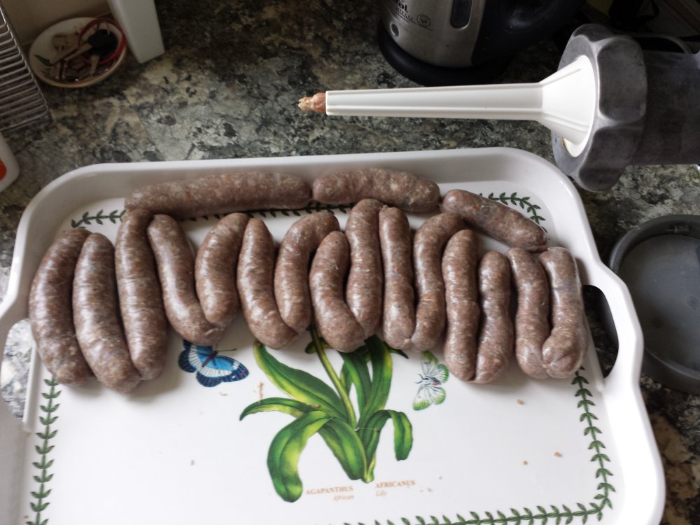 And here are all 18 of the sausages, along with a little bonus. The last of the sausage meat doesn’t emerge from the nozzle, once it has passed the end of the helical thingy, it doesn’t advance any further. I took it out, and made it into a patty, and fried it. It was delicious. I’m really looking forward to sausages for tea…