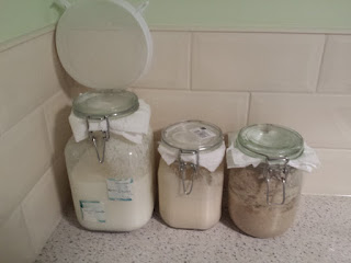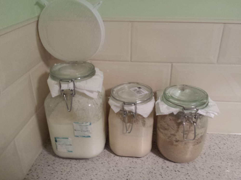 In the other two jars, I have sourdough starters, one plain, and one rye. The hardest part of keeping sourdough starters is getting used to the amount you have to throw away. You see, the micro-organisms in the starters excrete waste products; if you just add flour and water, these waste products build up. Chucking half of the starter away before you feed it means half the waste products are removed, and the remaining little chaps get to work in a cleaner environment. Anyway, on to Π…