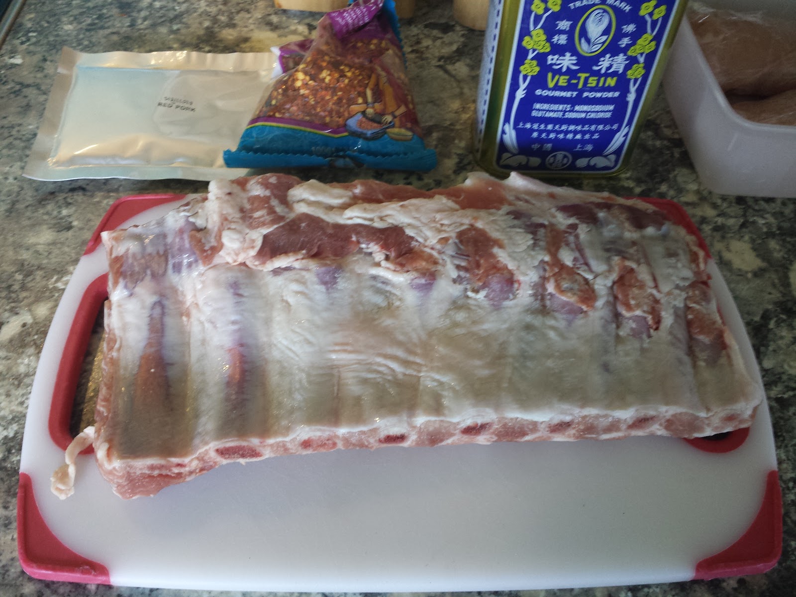 Next step is to put them into the newly made (because we have not barbecued for almost two years) rib marinade. It’s based on a sachet of Chinese style red-cooked pork spices, with various appropriate additions. The ribs are boiled in the marinade for twenty minutes. The marinade is now in the freezer, waiting for the next batch of ribs. It improves each time it is used….