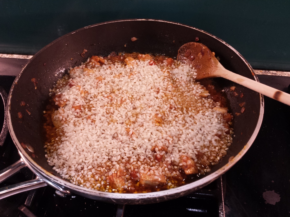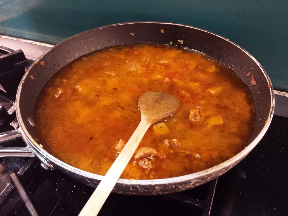 Once they seem to be done enough, add the rice, as above, and stock. This is chicken stock from a stock cube (I know, I should be using home made stock, but I’ve run out of it) with some saffron added. Unlike a risotto, where you add the stock a bit at a time, it all goes in at once for a paella. Try not to stir it any more than you need to to stop it sticking to the pan.