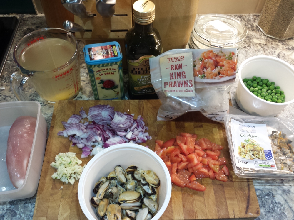 No, I’m not going to give you a recipe. There are thousands of them on the web, and most of the ones that don’t tell you to put chorizo in will be quite acceptable. Here are the ingredients I used.