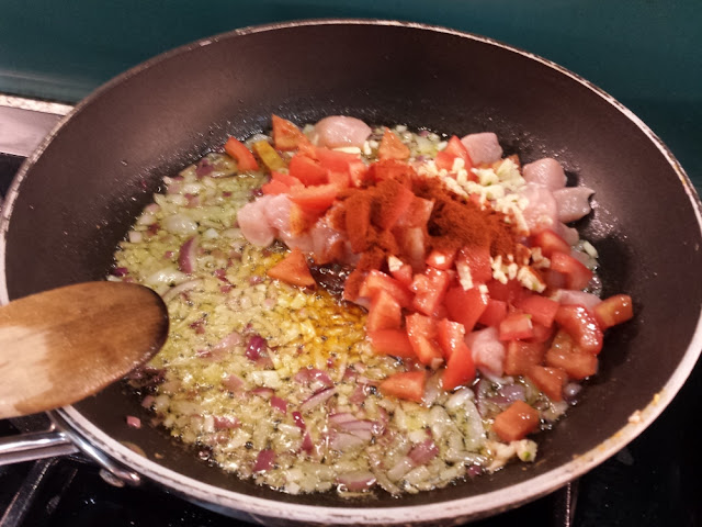The onion gets cooked in olive oil until it’s soft first, then the chicken, garlic, peeled deseeded tomatoes, and paprika go in.