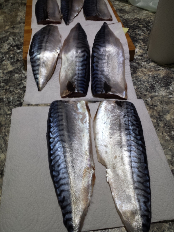 Here are the fillets. They are rather pretty this way up, and you don’t get to see some of my rougher knife work this way. I salted them for about half an hour, but forgot to take any pictures of that.