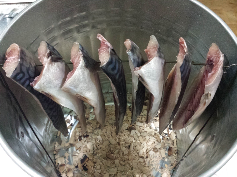 The fillets, hanging on the wire, looked lovely, and were all ready for some hot, smoky action.