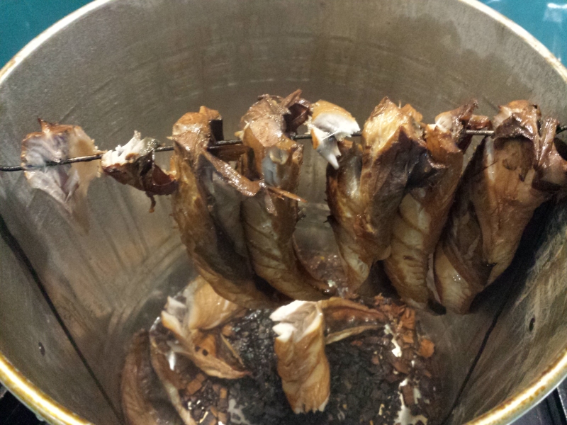 I gave it about fifteen minutes of heat, and stopped. There was a fair bit of smoky condensation around the edge of the lid, and it turned out to be more than there would have been if the fish had behaved themselves, and stayed on the wire.