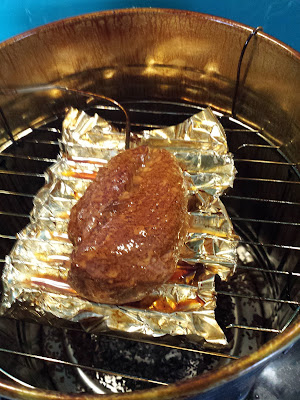 I‘m not sure if you can see it very well in this shot, but smoke is escaping. This time, the wood was a blend of cherry, beech, and alder. I thought maybe the oak I used last time might be a bit too strong. Twenty minutes seemed like a suitable length of time to smoke for, and indeed, the wood ran out of smoke at about that point anyway.