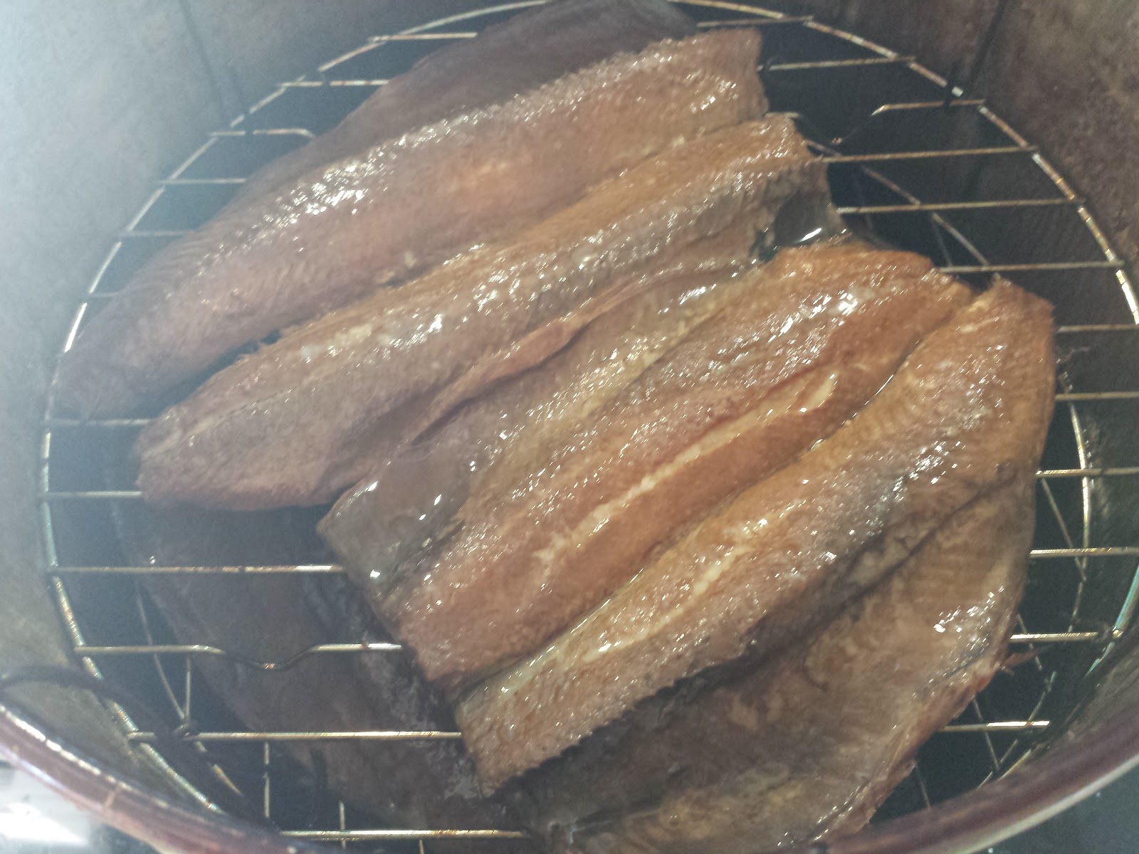 Cutting along one side of the spine, almost all the way to the top of the fish, enabled me to open them out into the normal kipper shape. I’m going to have to remove the bones from any I try to serve to Mrs Walrus, of course, but these are not shop-style filleted kippers. I was going to leave the tails on, but it made them harder to fit on the racks. In big smoke houses, they use the tails to hang the herrings up for kippering, I believe. Having had fish fall down onto the smoking wood in a previous adventure, I did these beauties on racks. The racks are suspended on hooks made from 2mm galvanized wire, quickly bent with a pair of pliers. At some point, I will make something that doesn’t have to hang over the edge of the smoking bin, as that lets quite a lot of smoke out.