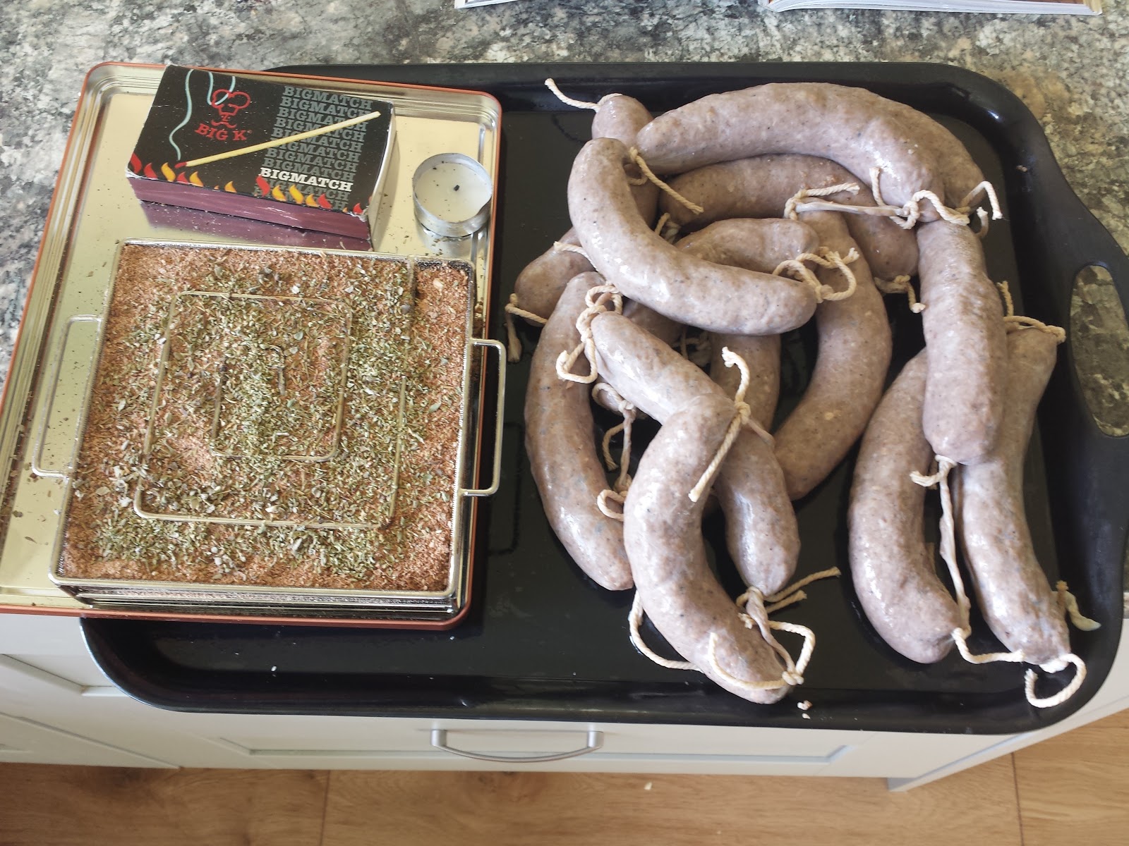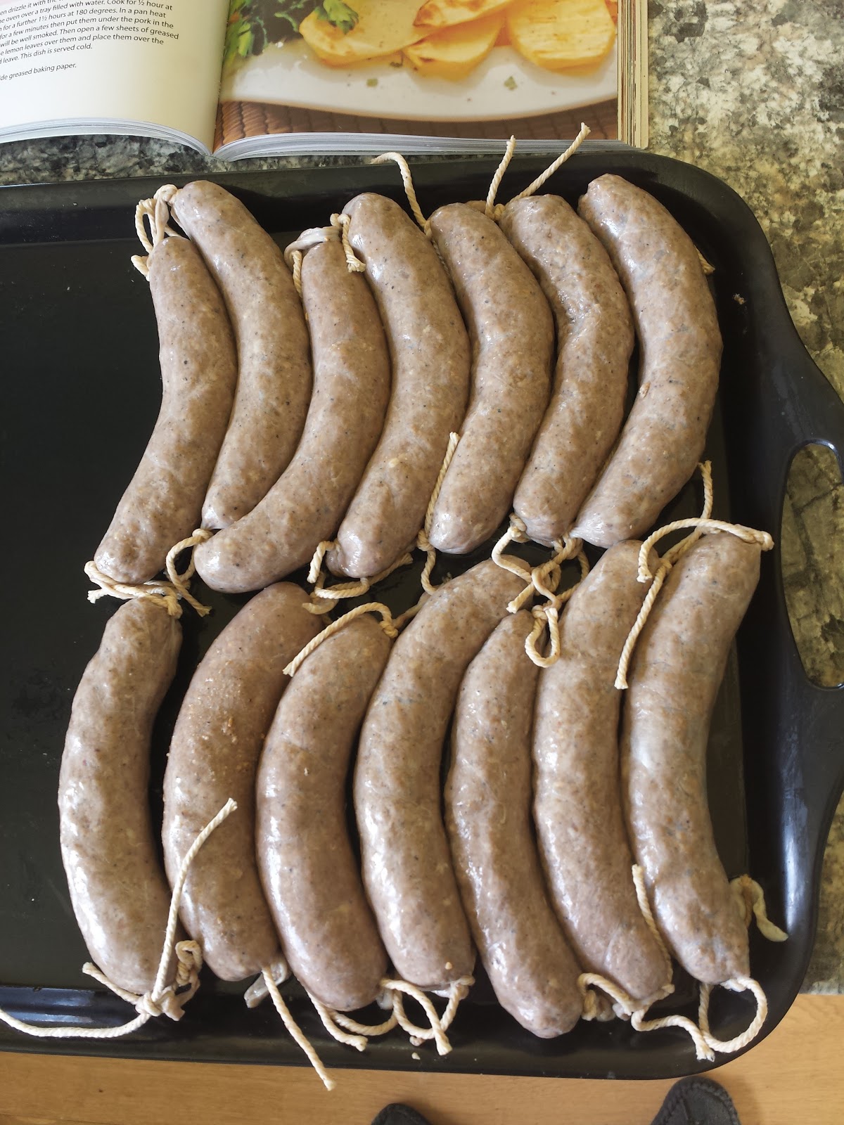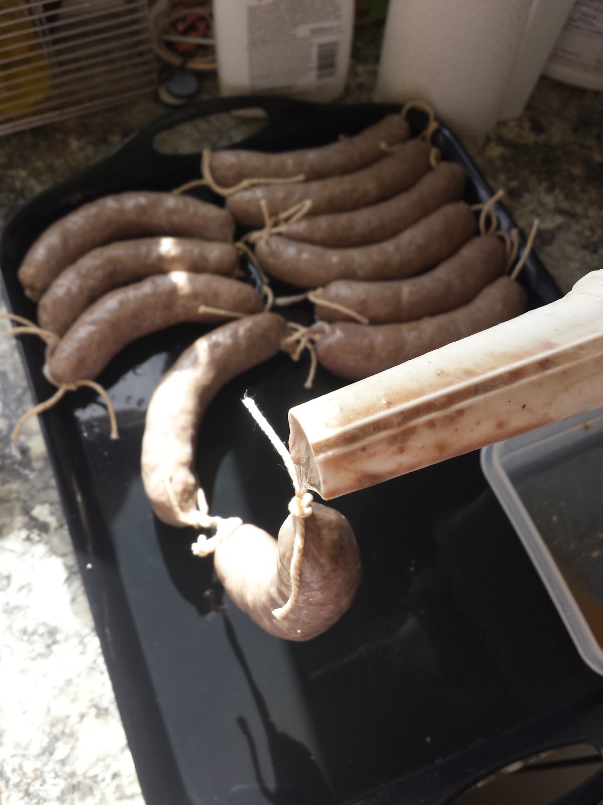 Still, the resulting fourteen sausages looked reasonable. They are tied with butchers’ string like that so that they would hang easily over the wire at the top of my large smoking dustbin. You might not be able to see it, but most of the sausages are linked together by unfilled bits of casing.