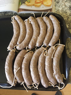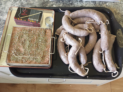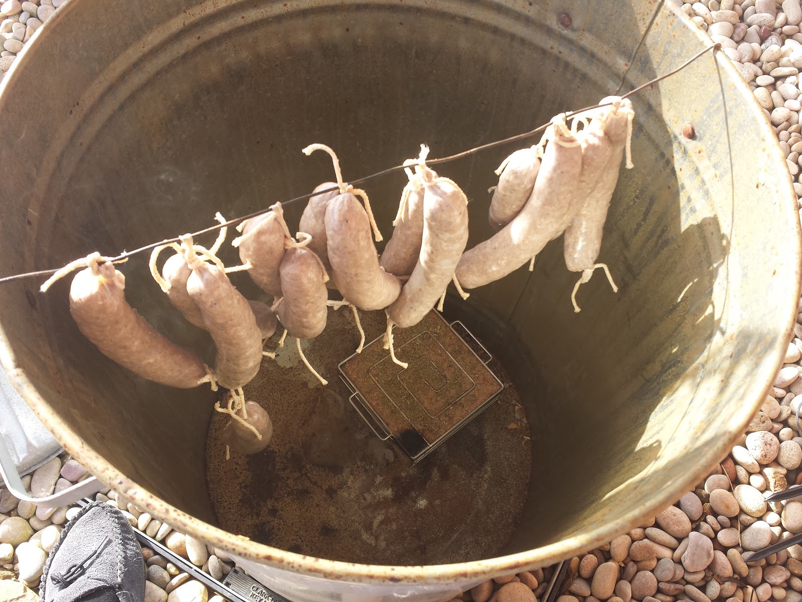 Here are the sausages, hung up in the smoker (galvanised dustbin) yesterday evening, with the smoke just starting. A few hours later, vinegar dripped on the sawdust and put it out.