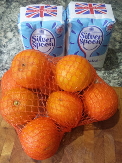 As well as a Kilo of oranges, you will need two Kilos of granulated sugar, and two lemons. I don’t know why Tesco is only stocking foreign sugar, but local shops like Spar and the Co-op do have British sugar, made from beet. [It may have something to do with a certain government minister who used to be high up in that foreign sugar company.]
