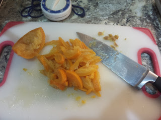 Put the chopped up peels in the pan with the juice, and bring them to the boil.