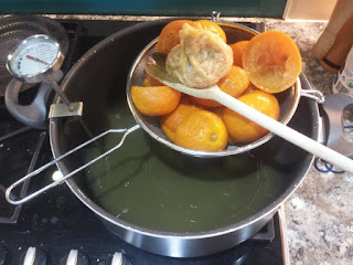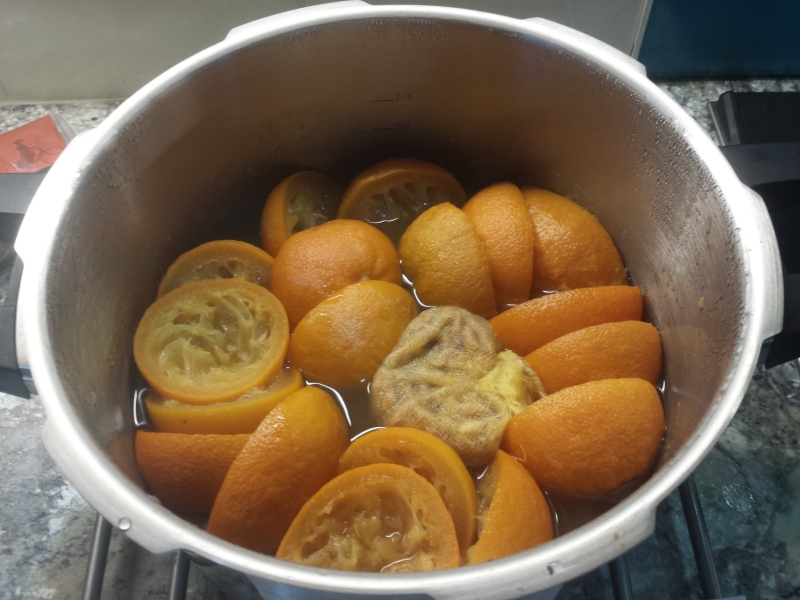 And here’s a picture of the contents of the pressure cooker after ten minutes of boiling at full pressure, followed by allowing them to cool naturally to room temperature. Notice that the pith of the oranges is cooked, and very much softer than before.