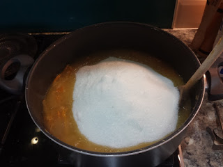 Tip in the two Kilograms of sugar, and stir until it is properly dissolved. Keep heating, and keep stirring. You need to raise the temperature to 105°C.