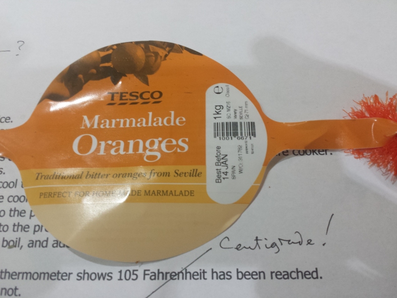I was never all that happy with the previous batch of marmalade I made in 2014. I thought it had been boiled too much, as it was quite a dark colour, and recently, I noticed that what I thought was the last jar was getting quite low.* There are only a couple of weeks of the year when the right oranges for marmalade making are in the shops, and last week I found some in Tesco. I grabbed the last Kilo.