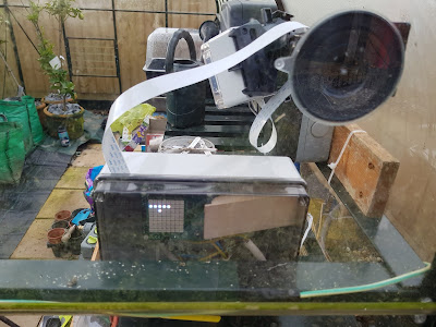 Here’s the greenhouse computer in situ. The air from the fan is now directed across the sensors on the Sense HAT, with the intention of measuring the temperature of the air in the green house, rather than the air in the case that the Pi 3 has warmed up. It’s just a balsawood duct, as thats an easy material to cut and glue.