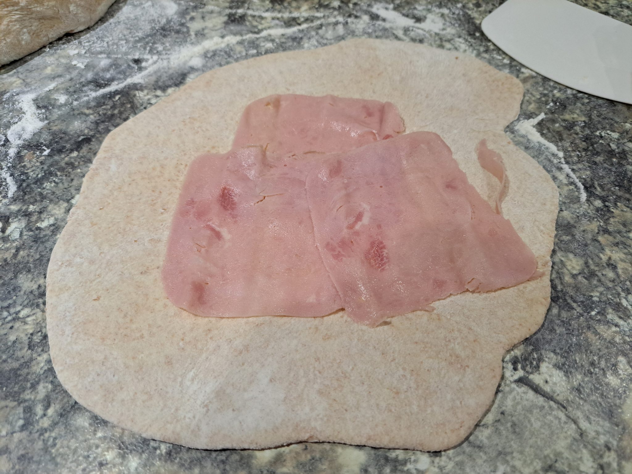 Previous attempts of mine to make this sort of thing went wrong because the molten cheese leaked out, mainly because I had the joins underneath when I baked it, instead of on top. But, to make sure, I added a layer of wafer thin ham slices. I think the leakage may have been made worse because I previously used ordinary, cheap Camembert, which seems more runny than La Rustique, when it’s cooked.
