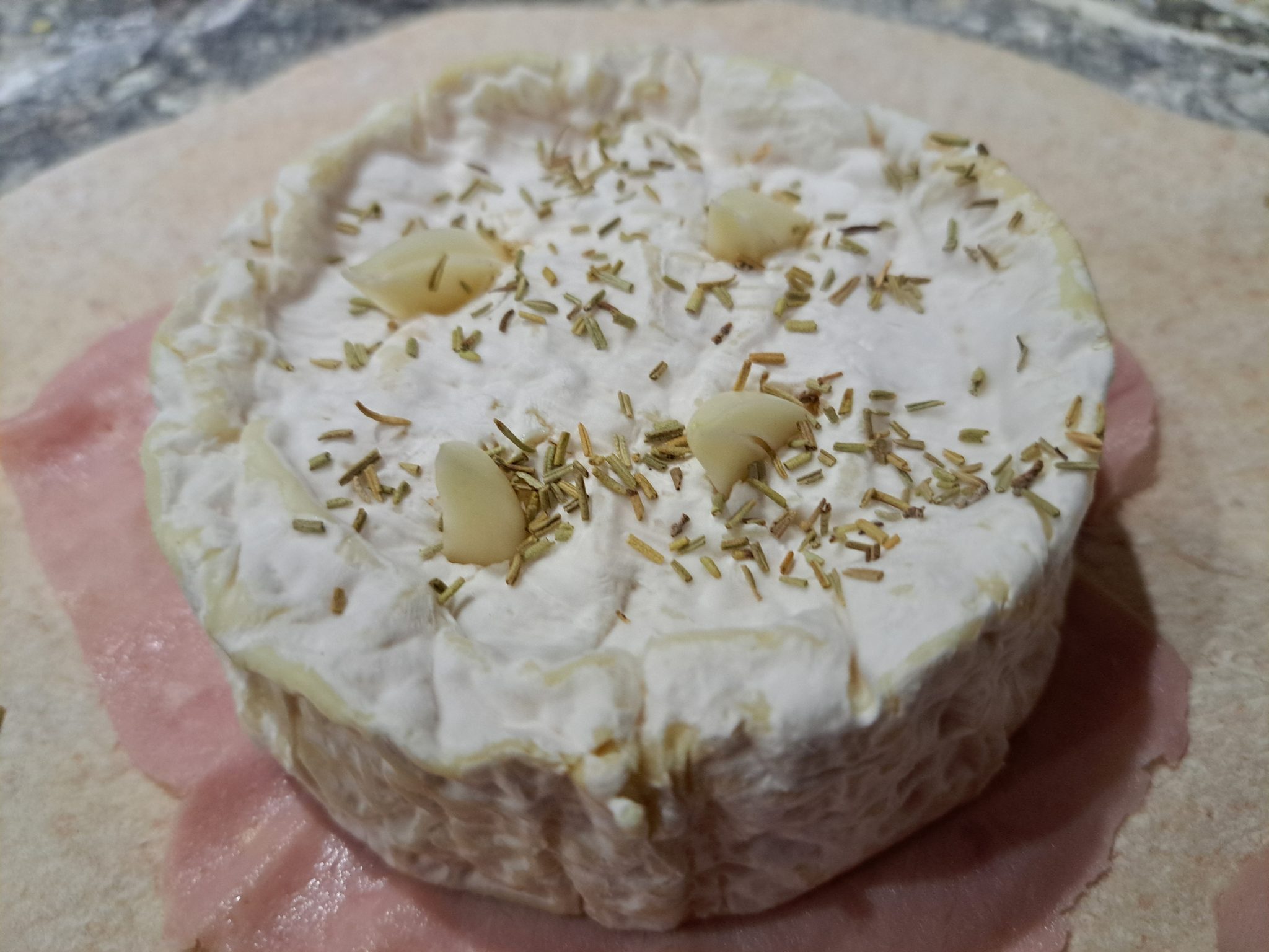 I put the cheese on top of the ham, cut slots in it, pushed garlic pieces into the slots, and sprinkled it with rosemary.