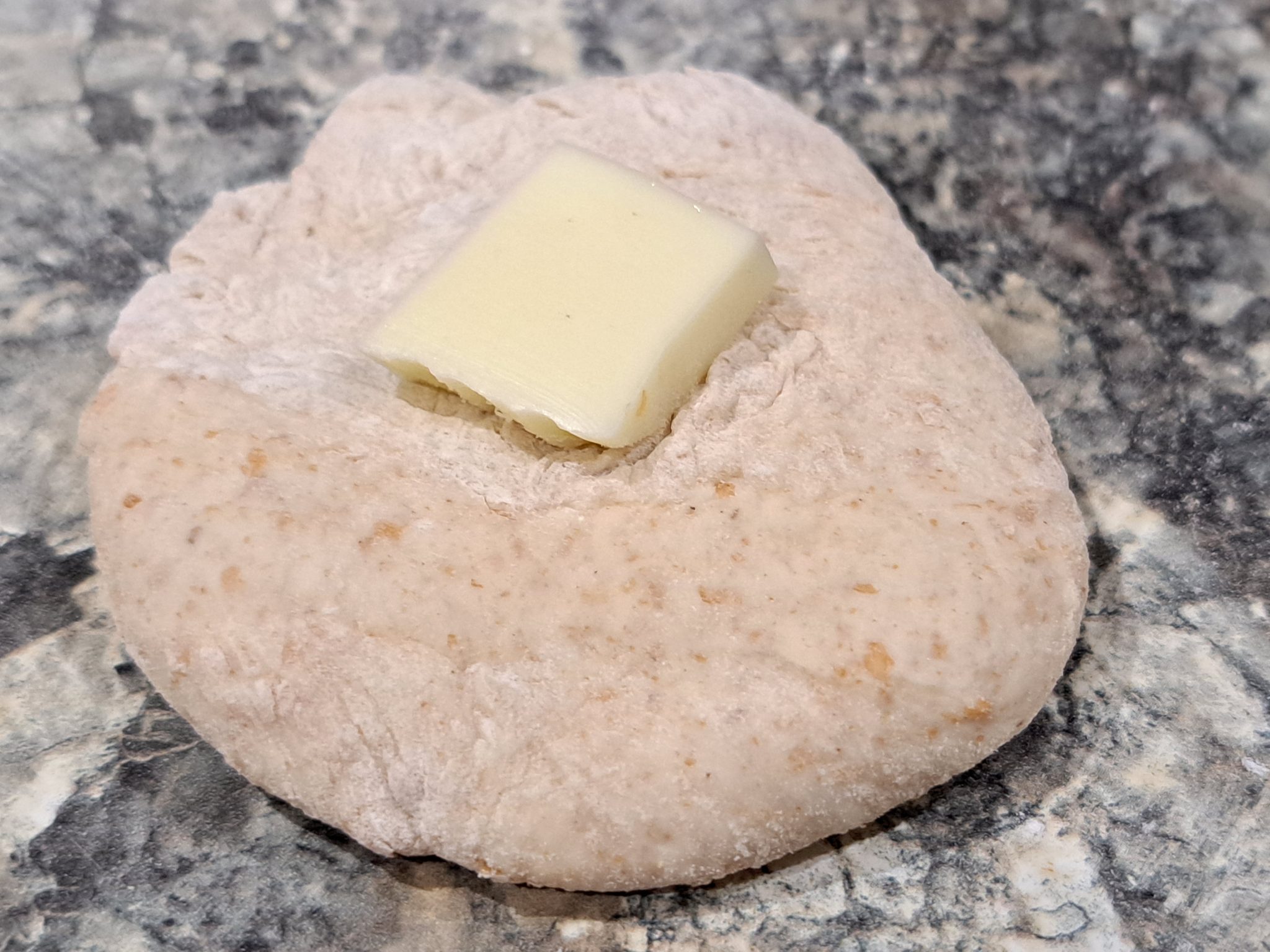 Then, I folded the dough over the top, not particularly tidily, and gently pressed it to seal it together. A lot of recipes leave the top of the cheese exposed, and I may try that another time.