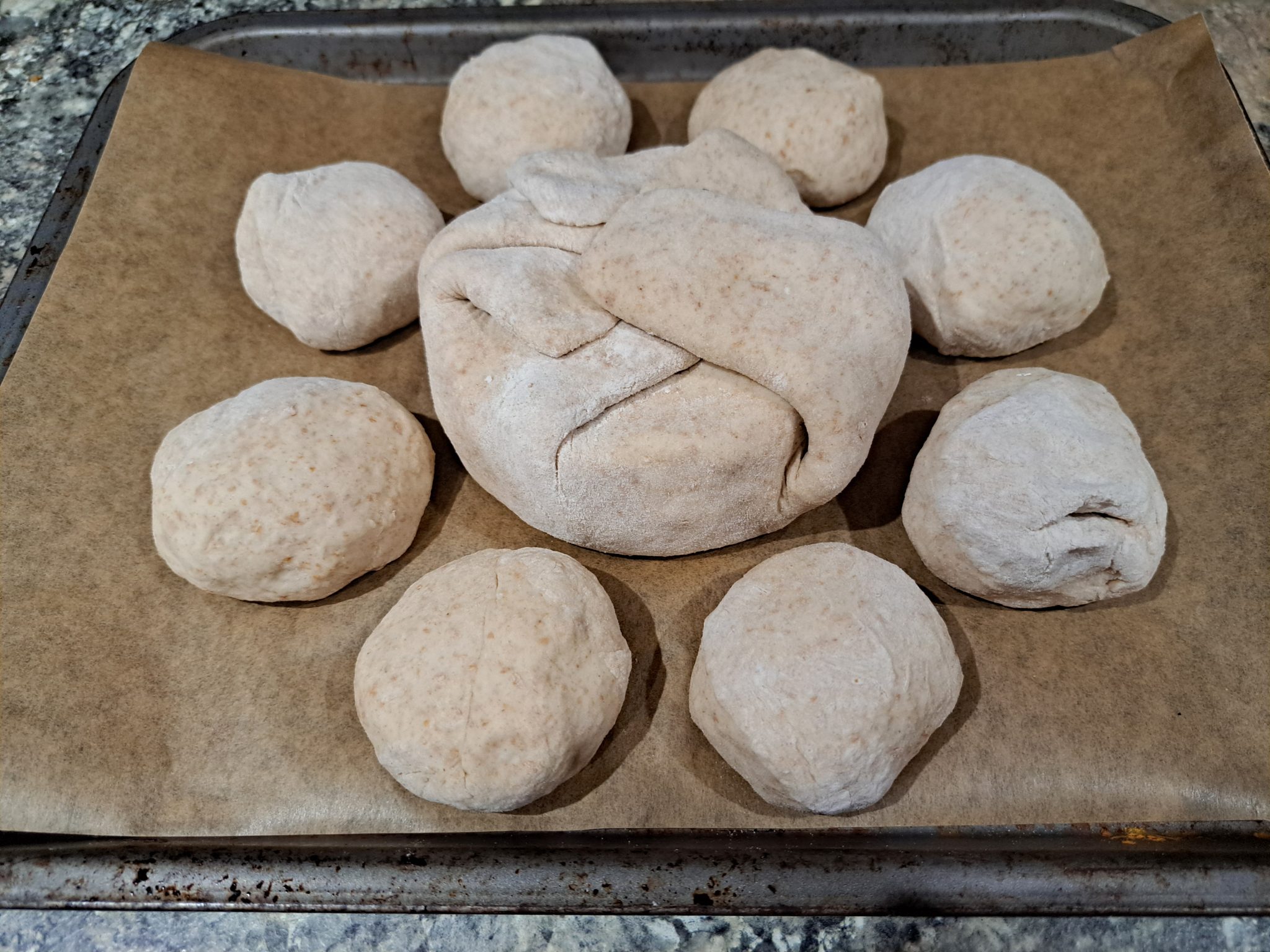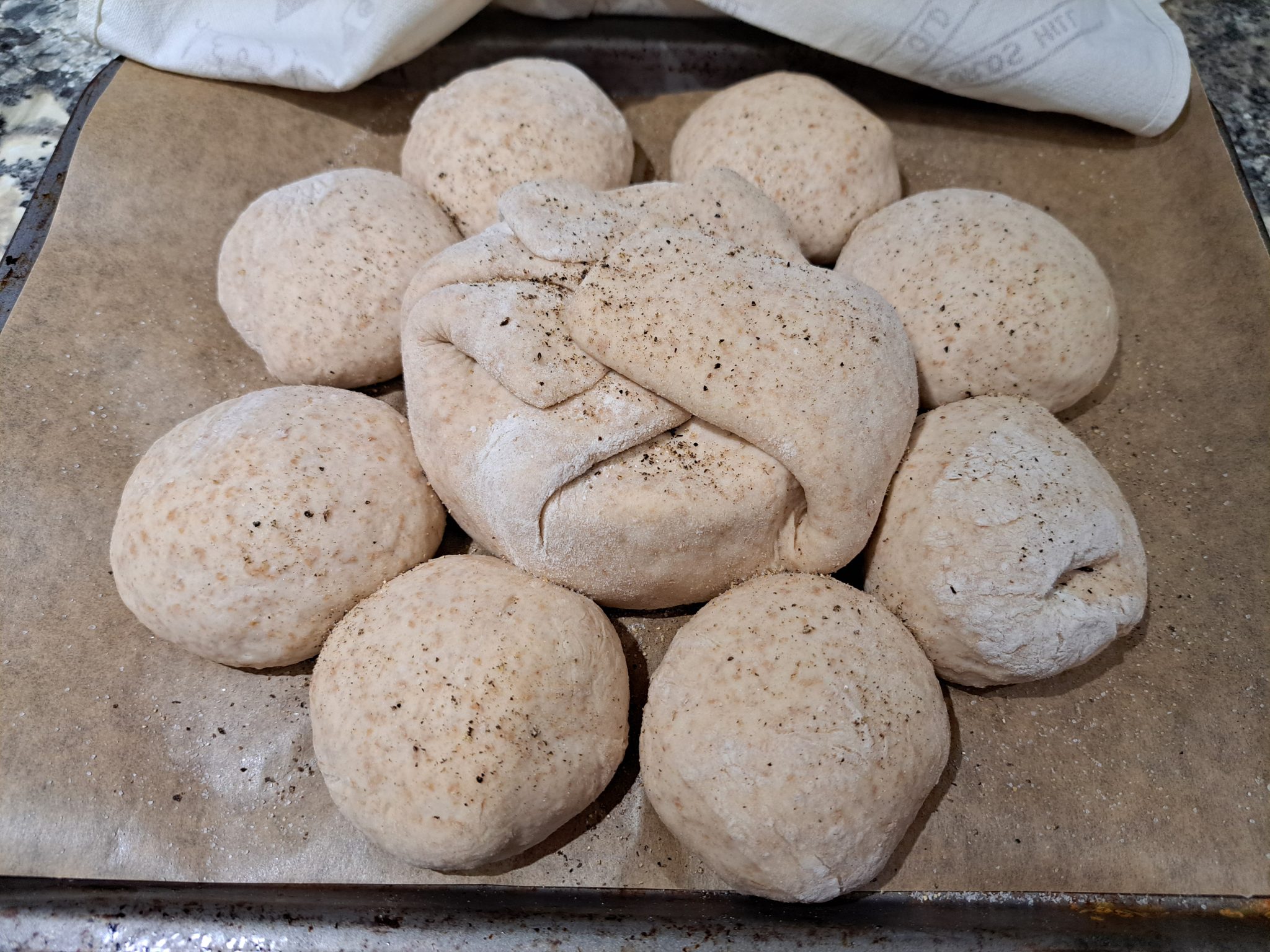 Then, I left them in a warm part of the kitchen to rise for a while, until the rolls were starting to merge with the main loaf, like this…