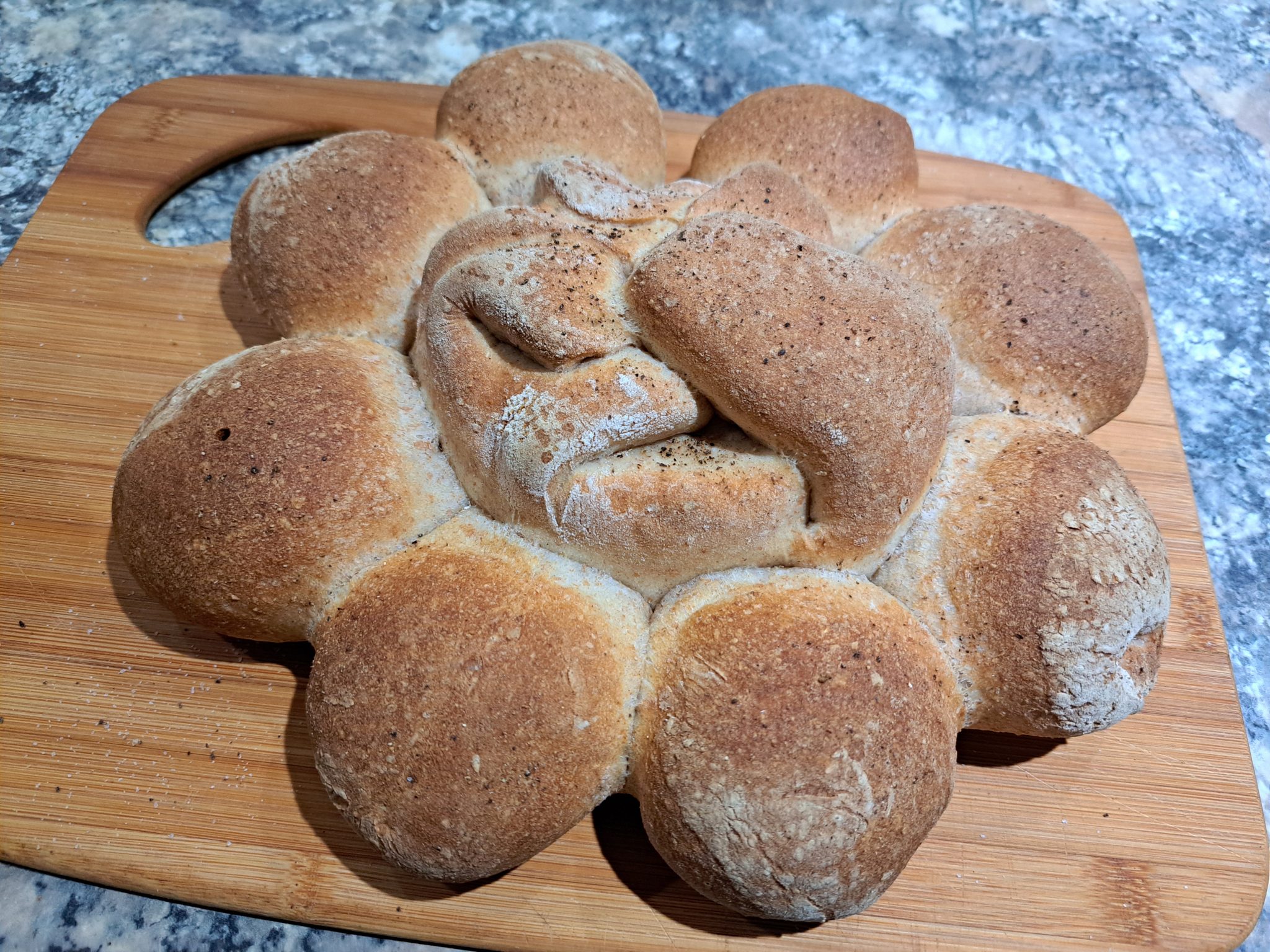 I divided the remaining dough into eight pieces, put a bit of mozzarella that was lurking in the fridge into each one, rolled them into, well, rolls, and arranged them around the main loaf.
