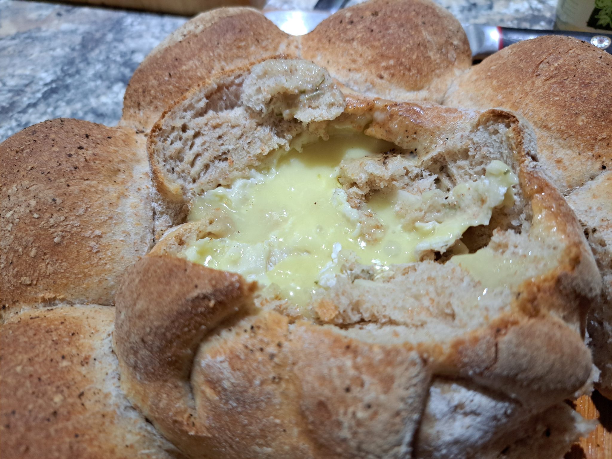 Nice Mr Tesco sold me a beautifully smelly La Rustique Camembert cheese for a £1, and I decided I wanted to bake it in a loaf of bread. Not a ready made loaf, which was what all the online recipes I found showed how to do. So, here’s a way to make a cheesy loaf from scratch, in case you wanted to.