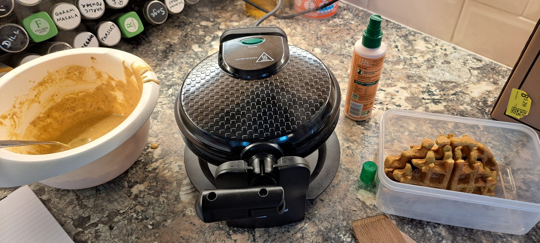 The amounts in the list above give just under three waffles. I expect adding a couple of beaten eggs would have made just the right amount of batter. The result is chewy, like seitan, but more airy, and the flavour depends on your curry powder. I used the mild curry powder recipe from Pat Chapman’s “250 Curry Recipes and Accompaniments”.