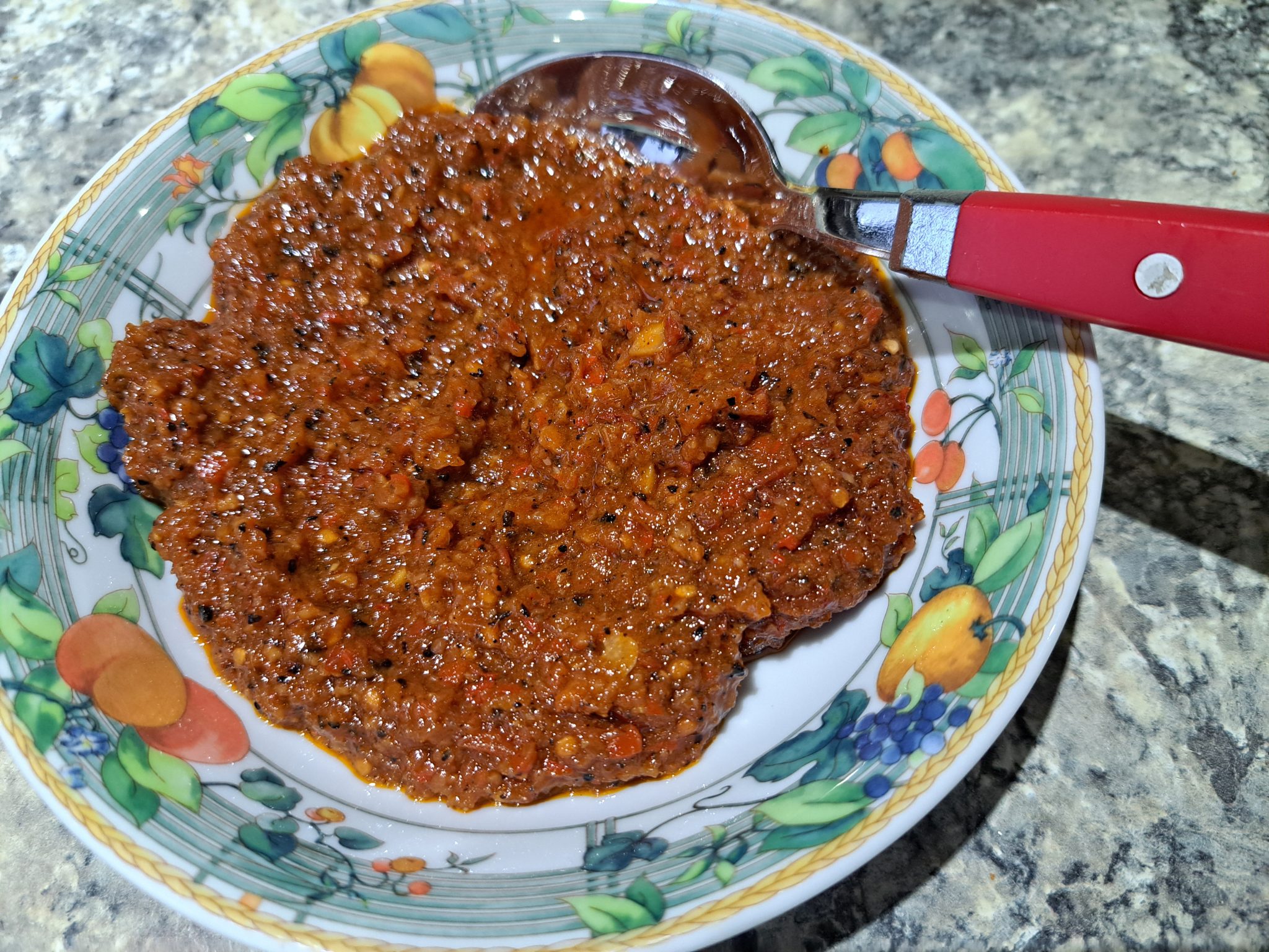 This is a tomato and chilli sambal, which I think could have done with quite a lot more chilli. Home grown tomatoes made it very tasty, though.