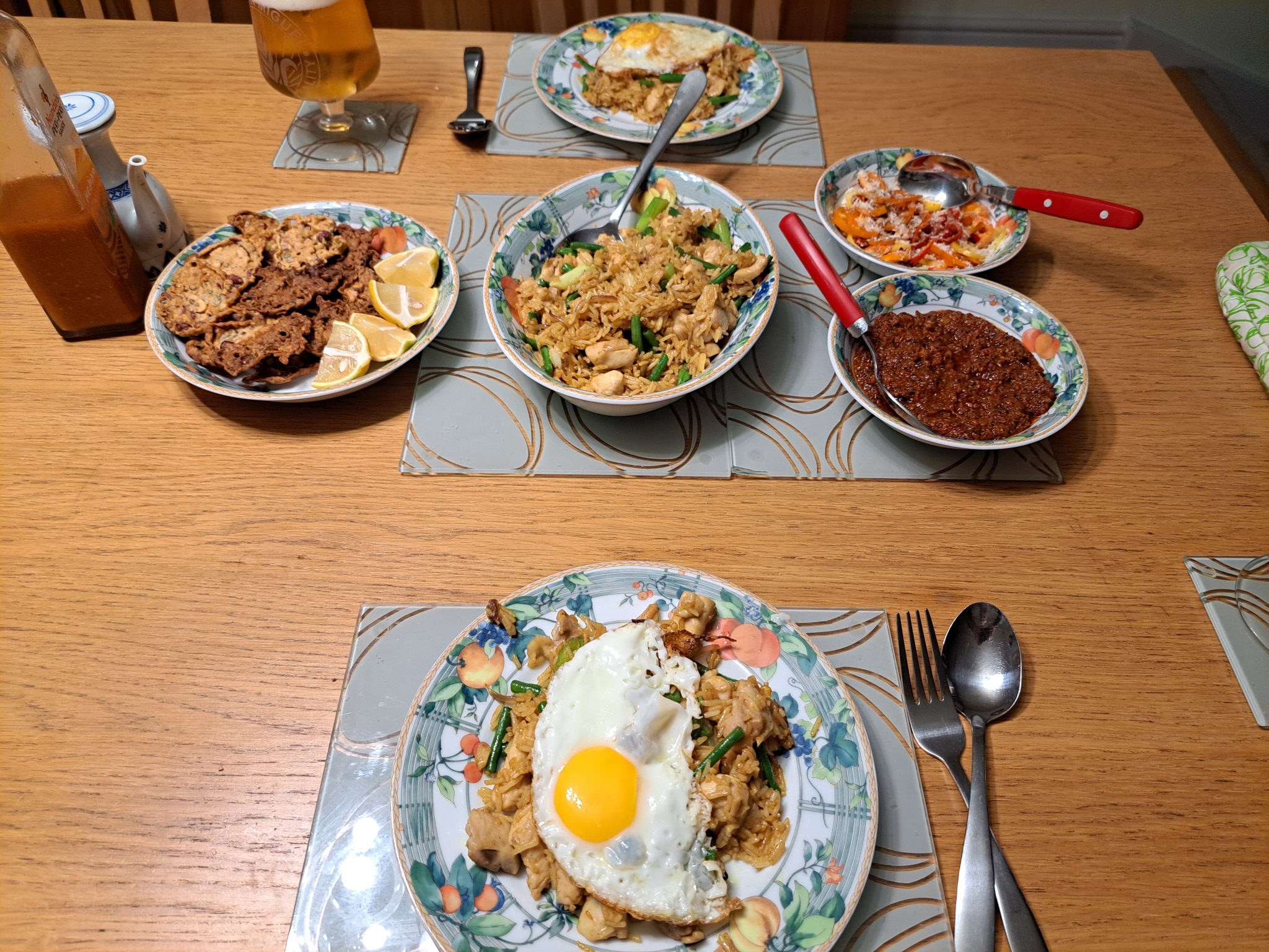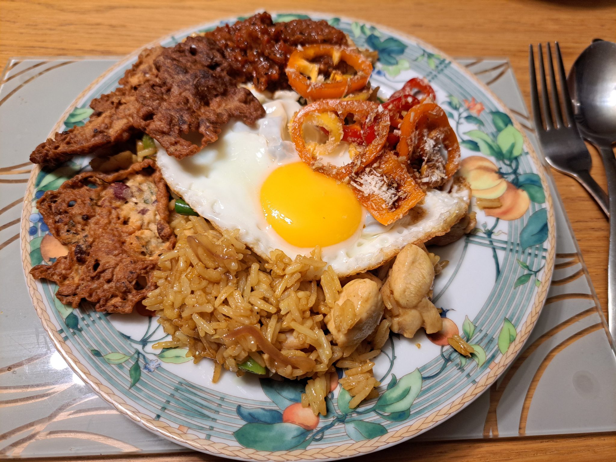 What on Earth is that? Indonesian chicken fried rice, with accompaniments.