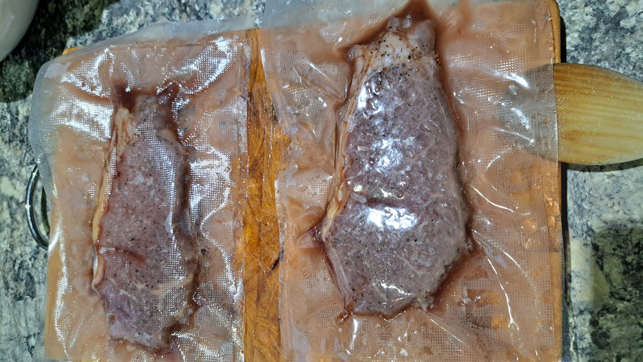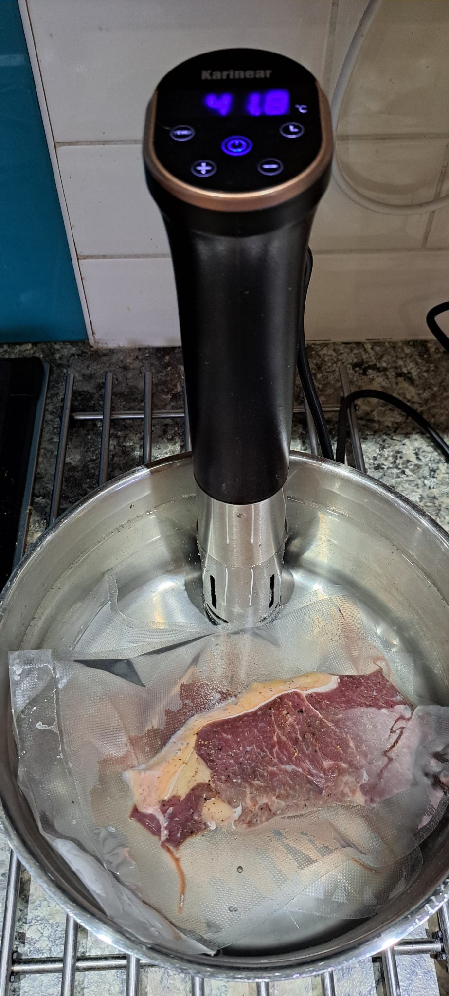 I already had a nifty device for vacuum packing the steaks, so I seasoned them, and got the air sucked out of the bags. You don’t need this device, really. It’s entirely possible to use Zip Lock bags, and get as much air out as you can, though they may tend to float if you don’t get it all out. But it’s a cooking toy, so I love it. Made by Tayuugo, if you want one like it…