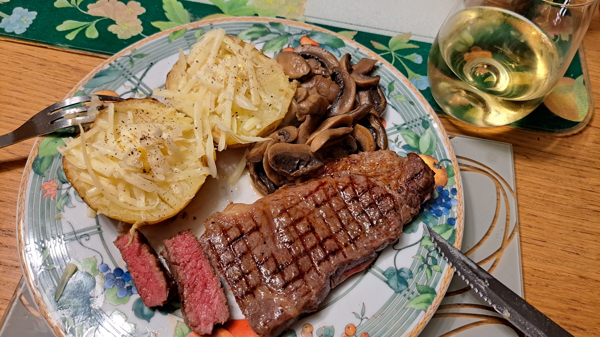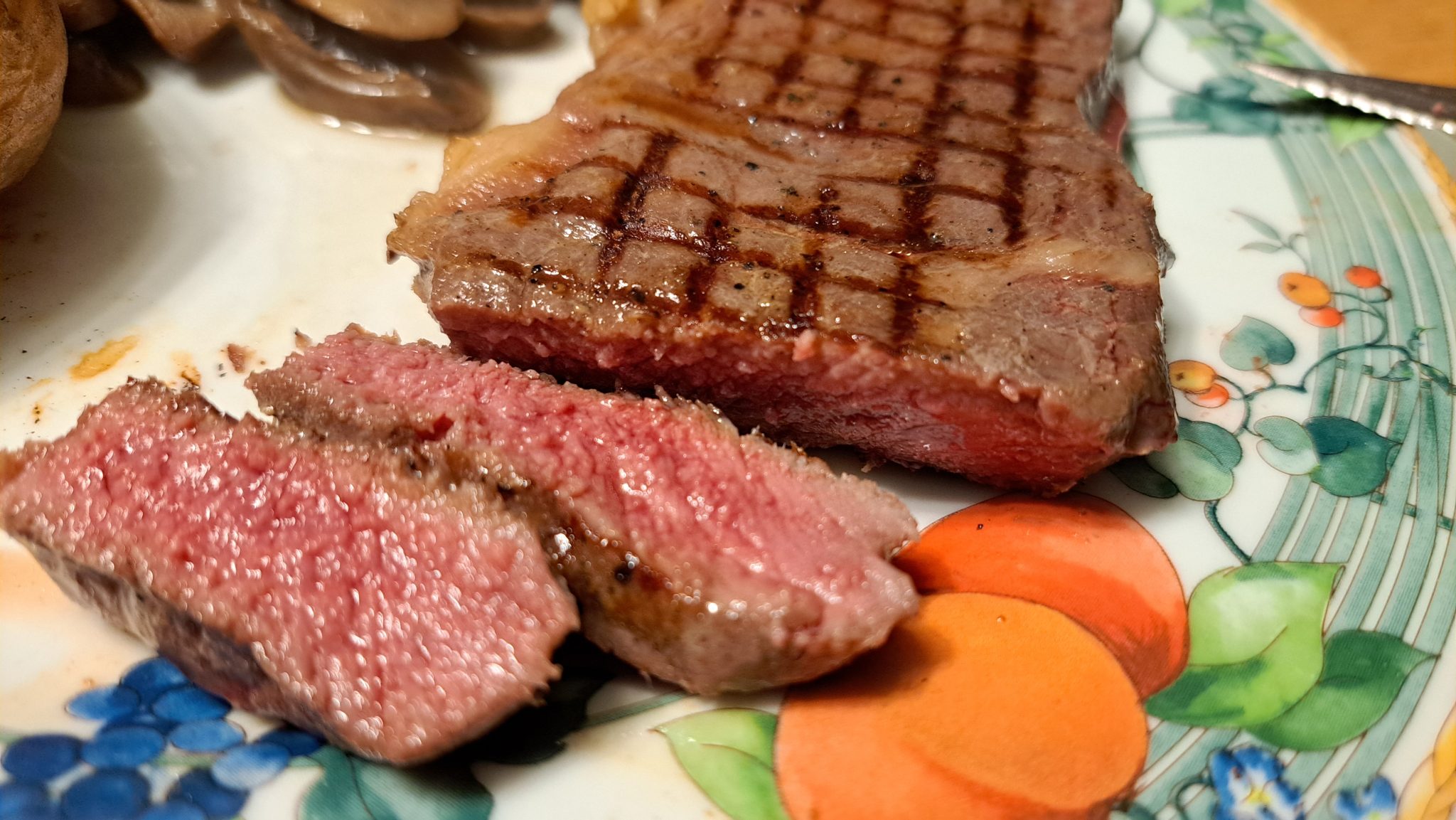Now, you may call that rare, rather than medium-rare, and you may be right, but it is definitely what I was aiming for. The big difference between cooking the steaks this way, and frying them, is the way they’re not overcooked at the surface, with a smaller pink area inside. Now that I know the process, I will not be using cheap supermarket steaks like these, but really good ones from the friendly local butcher.