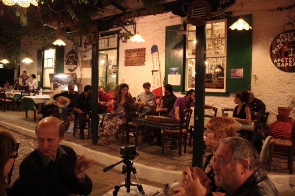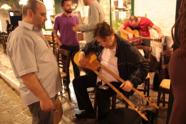 Later on, I went to Douskos' Restaurant before the fun was due to start, to set up my sound gear. I decided to put the Archos on stage, having been unable to get access to a near enough mains socket inside the restaurant. The staff were terrifically helpful, but their sockets were all full. I set the Archos running, and recovered it later, only to find it had not recorded anything. I had my better recorder on the table I was sat at, but that way tends to record a lot of conversation and knives and forks. This year's band was those parts of the SOAS Ad Hoc Rebetiko Band, also known as the Famous SOAS Rebetiko Band, who had not gone home after their visit to Istanbul. They were joined by Ali Fuat Aydin and Cenk Guray, who were not easy to hear, but worth listening to. All in all, I had a very pleasant evening eating, drinking small glasses of retsina, chatting with friends and making [probably not very good] recordings.